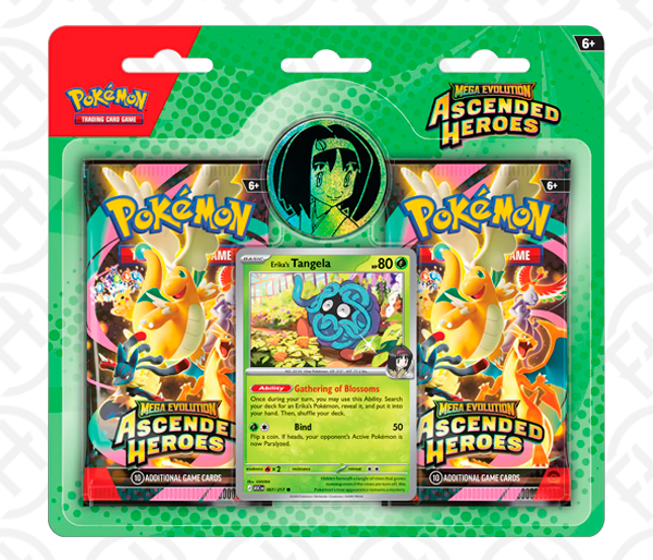 In this collection, you’ll find a promo card featuring Erika’s Tangela, a metallic coin featuring Erika, and two booster packs from the special Mega Evolution—Ascended Heroes expansion.