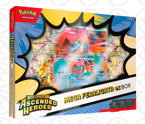 Mega Evolution Pokémon ex Embody Heart and Power in Battle! Forge a bond that takes your partner Pokémon’s strength past the limit with Mega Evolution! In this box, you’ll find Mega Meganium ex, Mega Emboar ex, or Mega Feraligatr ex as a playable foil promo card, along with an oversize lenticular card with dynamic artwork and four booster packs from the special Mega Evolution—Ascended Heroes expansion. The Pokémon TCG: Mega Evolution—Ascended Heroes Mega Feraligatr ex Box includes: • 1 foil promo card featuring Mega Feraligatr ex • 1 oversize lenticular promo card featuring Mega Feraligatr ex • 4 Pokémon TCG: Mega Evolution—Ascended Heroes booster packs