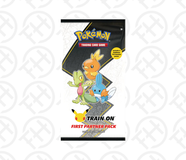 Includes three oversize promo cards featuring the first partner Pokémon of the Hoenn region—Treecko, Torchic, and Mudkip—plus two regular Pokémon TCG boosters.