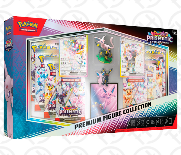 The Pokémon TCG: Scarlet & Violet-Prismatic Evolutions Premium Figure Collection includes: