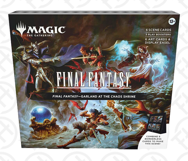 This Magic: The Gathering—FINAL FANTASY Scene Box, Garland at the Chaos Shrine, contains 6 traditional foil borderless scene cards, 6 art-only scene cards, 3 Play Boosters, and a paper display easel. Each Play Booster contains 14 Magic: The Gathering cards, including 1–4 cards of rarity rare or higher, 3–6 uncommon cards, 6–9 common cards, and 1 land card. One card of any rarity is traditional foil. The land card is also traditional foil in 20% of Play Boosters. This product does not contain a Golden Chocobo card (available in English-language Collector Boosters only).
